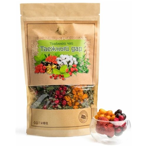 Травяной чай таежный ДАР — кипрей, курильский чай, шиповник, земляника, рябина, душица, мелисса, мята, брусника, облепиха, черная смородина, лабазник, лист малины, первоцвет, зверобой, лист смородины, чабрец, 50 г, Территория тайги