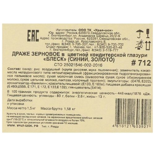 Драже зерновое в цветной кондитерской глазури Блеск: золотой, синий, 1,5 кг