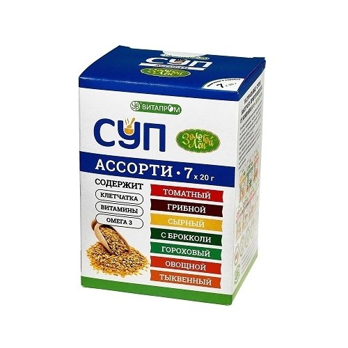 Суп сухой быстрого приготовления "Золотой Лён" Ассорти (7 видов супов), коробочка, 7 пакетов,140 гр