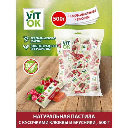Vitok Пастила фруктовая 100% натуральная с яблочным пюре, клюквой и брусникой без сахара, полезная конфета -батончик, 500 г