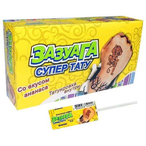 Жевательная конфета ВК "Зазуага" с тату со вкусом Ананаса на палочке / 50 штук по 11,2 гр.