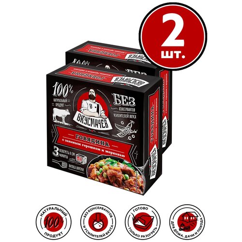 Говядина с зеленым горошком и морковью/ вкусмачев/ готовое блюдо/ сухой паек/ 2шт по 250г/ вилка в комплекте