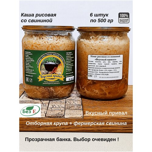 Вкусный привал / Каша рисовая со свининой / Домашняя тушенка / Каша / Тушенка / В стеклянной банке / Консервы мясные / Тушенка кусковая