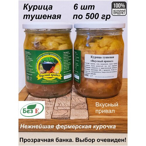 Вкусный привал / Курица тушеная / Высший Сорт/ Домашняя тушенка / Тушенка / В стекле / Консервы мясные/ Кусковая тушенка из курицы