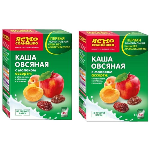 Ясно cолнышко Каша овсяная Ассорти с молоком №10: с абрикосом, яблоком, изюмом, порционная, 2 шт по 270гр
