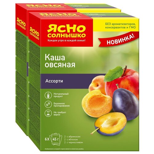 Ясно солнышко Каша овсяная ассорти № 5 с абрикосом, яблоком, черносливом, (6 пак. по 45 г) 2шт. Х 270гр.