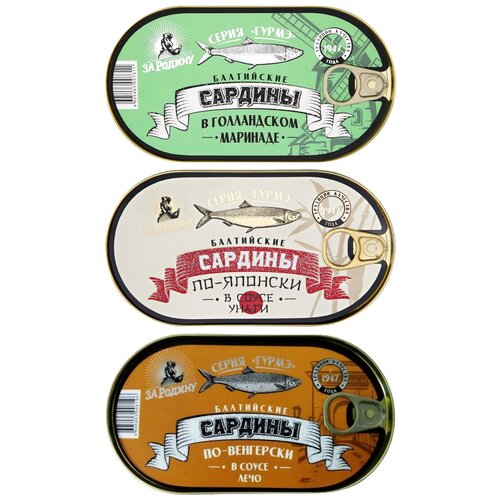 Сардина балтийская "За Родину" ассорти — 3 вкуса, 3 банки 175 г с ключом.