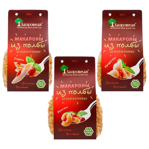 Макароны Здороведа цельнозерновые из полбы "Перья", "Рожки", "Ракушки", набор 3х 350 г