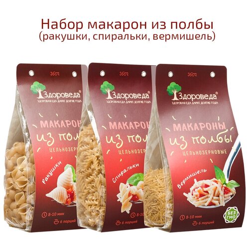 Макароны цельнозерновые из полбы Здороведа, 3 шт. по 350 гр. / ракушки / спиральки / вермишель