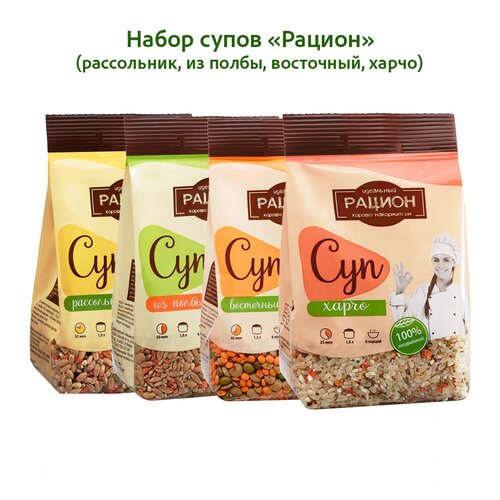 Набор супов "Рацион" от Здороведа, 4 шт. по 150 гр. (рассольник, из полбы, восточный, харчо)