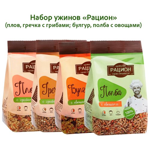 Набор ужинов "Рацион" от Здороведа, 4 шт. по 150 гр. (плов и гречка с грибами, булгур и полба с овощами)