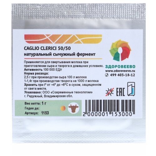 Натуральный сычужный фермент для сыра и творога CAGLIO CLERICI 50/50, пакет 1 гр на 40 литров молока (Здоровеево)