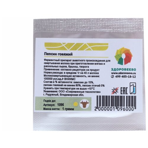 Натуральный сычужный фермент для сыра и творога Пепсин говяжий, пакет 1 г на 40 литров молока (Здоровеево)