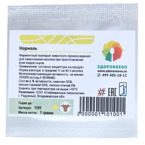 Натуральный сычужный фермент для сыра и творога Нормаль, пакет 1 г на 40 литров молока (Здоровеево)