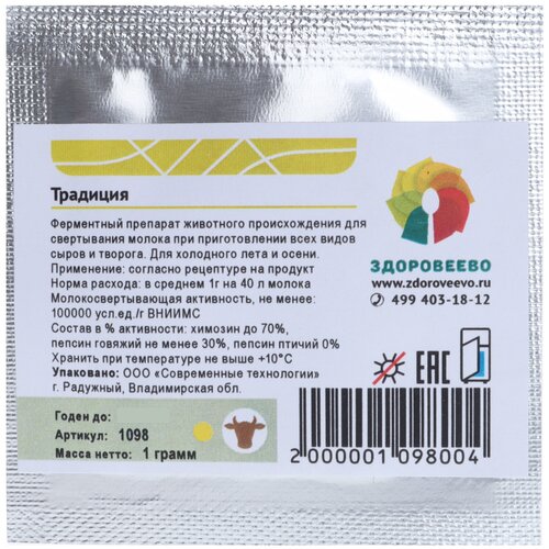 Натуральный сычужный фермент для сыра и творога СП-70 Традиция, пакет 1 г на 40 литров молока (Здоровеево)