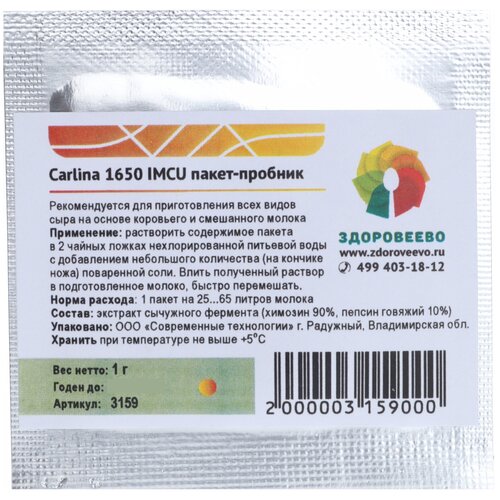 Сычужный фермент для сыра и творога Carlina 1650 IMCU, пакет 1 г на 25 — 65 литров молока (Здоровеево)