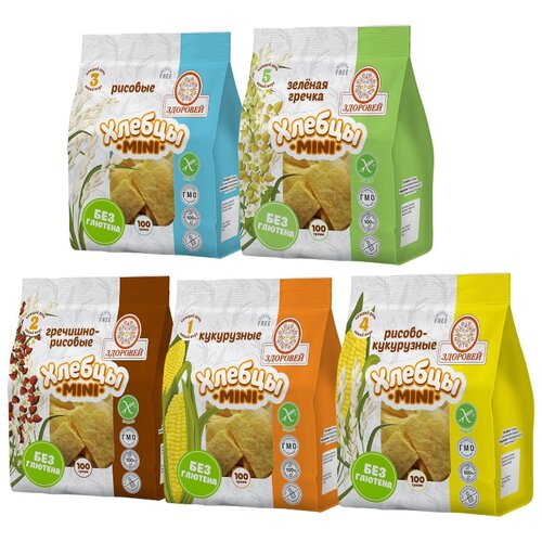 Хлебцы безглютеновые мини гречно-рисовые, кукурузные, рисово-кукурузные, рисовые, с зелёной гречкой 100 гр. (Комбинат ДДП) 5 шт. в наборе