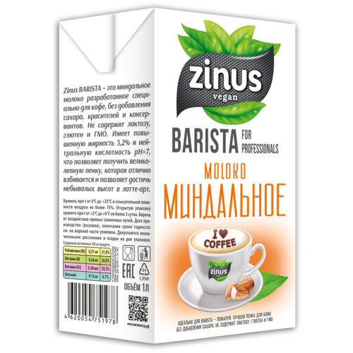 Zinus Молоко миндальное "Barista", 1000 мл