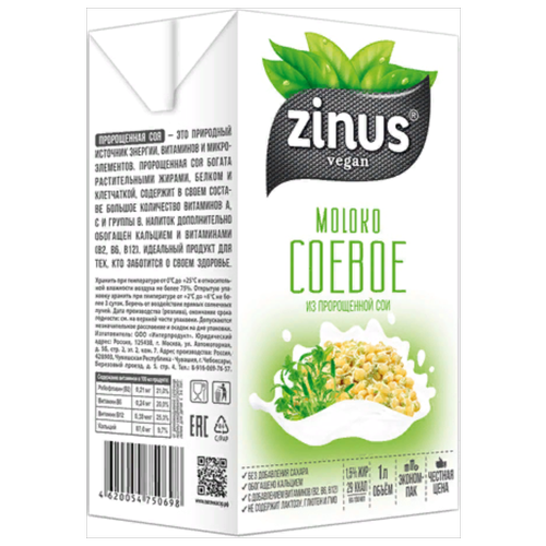 Молоко соевое, растительное, от производителя "ZINUS", 1 упаковка 1 литр