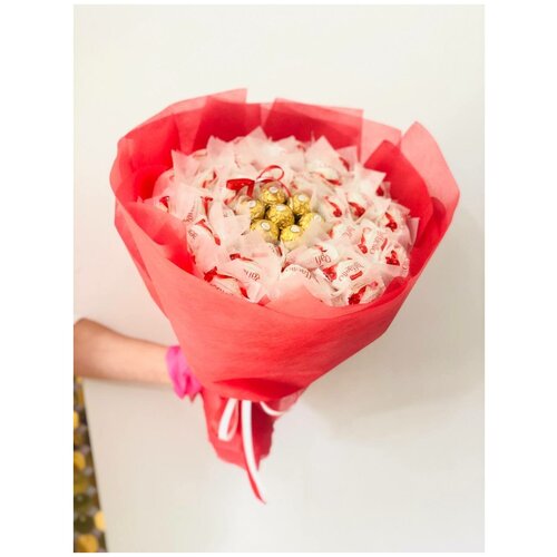 Оригинально составленный букет из рафаэлло не оставит равнодушной вашу сладкоежку. Такой букет можно подарить любой жительнице нашей страны.Вкусные и нежные конфеты поднимут настроение надолго!