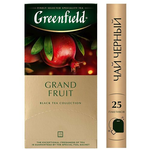 Чай Greenfield Grand Fruit черный с гранатом. Вся природная сила и глубина великолепного черного чая с лучших плантаций Индии воплощается в многогранном букете Greenfield Grand Fruit. Сочная кислинка спелого граната и свежая «хвойная» нота розмарина вносят в букет новые сложные оттенки, подчеркивая самобытный яркий вкус Greenfield Grand Fruit.
