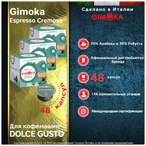 Кофе в капсулах GIMOKA Espresso Cremoso DOLCE GUSTO, 16 капс. — это сбалансированная смесь арабики и робусты с отборных плантаций создают приятный аромат с мягким и полным вкусом. Послевкусие приятное и стойкое.