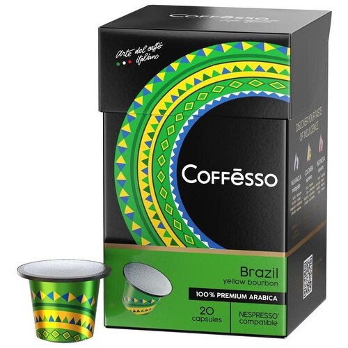 Coffesso приглашает в кофейное путешествие: попробуйте лимитированную коллекцию кофе из разных уголков планеты. Перенеситесь на мгновение в Бразилию: страну жаркого солнца, карнавала и вкуснейшего кофе! Расширьте горизонты кофейного наслаждения и вкусового многообразия! Coffesso — это та Италия, где вкус и искусство встречаются вместе. Рука виртуозного художника-бариста раскрывает нам секреты кофейного мастерства, а кофейные зерна проходят обработку по последней технологии обжарки. Именно поэтому для нас кофе — это больше, чем напиток. Кофе — это произведение искусства. Каждая чашка кофе может стать вашим личным шедевром, ведь само его приготовление является искусством. Вкус готового напитка зависит не только от качества зерна, степени обжарки и помола, чистоты воды или способа приготовления, но, порой, даже от вашего настроения. Раскройте новые оттенки палитры вкусов, используя разную степень помола и новые способы приготовления для создания Вашей идеальной чашки кофе! Минуты с чашкой кофе Coffesso прекрасны, потому что дарят наслаждение истинным кофейным искусством, вдохновляя им, развивают вкус, побуждая на эстетическое удовольствие. Для приготовления в капсульной кофемашине системы Nespresso. Бразилия во всем вкусовом многообразии. Интенсивность — 6. Рекомендуемый объем чашки: для эспрессо 50 мл, для лунго 110 мл. Вес кофе в одной капсуле: 5 г. Состав: 100% арабика. Срок годности: 18 месяцев. Хранить в сухом месте, в плотно закрытой упаковке. Страна производства: Россия.