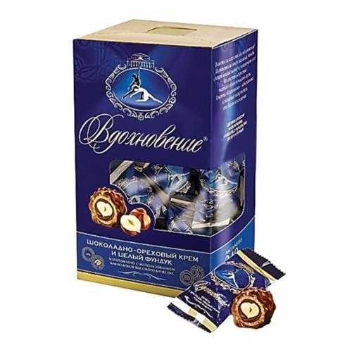 Конфеты шоколадные красный октябрь "Вдохновение" — целое ядрышко фундука, облаченное в нежный крем и покрытое тонкой хрустящей вафлей в шоколадной глазури с измельченными орешками.