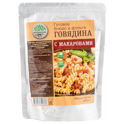* Состав продукта: говядина (не менее 37%), макаронные изделия, морковь свежая, лук репчатый сушеный, соль поваренная пищевая, масло растительное, специи