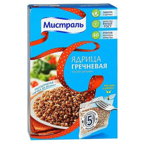 Мистраль Гречка ядрица, 5 шт. по 80 г. Быстроразваривающаяся гречневая ядрица Мистраль получена из отборных зерен пропаренной гречихи, которые проходят многоступенчатую очистку и обязательно промываются перед пропариванием. Идеально подходит для приготовления гарнира, а также каши на воде или молоке. В комплекте 2 шт.