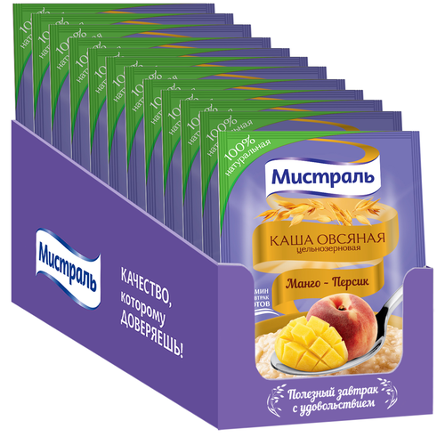 Экзотическая и ароматная каша-десерт Мистраль cо спелыми кусочками манго и персика перенесет Вас в жаркую шумную Индию, где манго считают «королем фруктов». По легенде именно в манговой роще Будда нашел спокойствие и просветление. Цельные полезные овсяные хлопья подарят энергию и чувство сытости надолго, а пребиотик-инулин укрепит иммунитет. Аппетитный завтрак и хорошее настроение готовы.