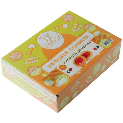 Фигурное сдобное печенье бискотти с начинкой из клубничного мармелада. Представлено в фирменной картонной коробке увеличенного размера.