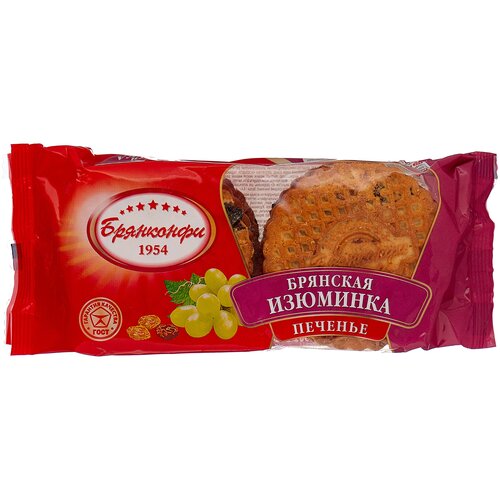 Состав: мука пшеничная; жир кондитерские (рафинированные дезодорированные растительные масла в натуральном и модифицированном виде, антиокислитель концентрат смеси токоферолов); сахар; виноград сушеный (изюм); инвертный сироп (сахар, регуляторы кислотности: гидрокарбонат натрия (сода пищевая), лимонная кислота); вода питьевая; сгущенное с сахаром цельное молоко (молоко нормализованное, сахар, лактоза); меланж яичный жидкий; разрыхлители: карбонат аммония, гидрокарбонат натрия (сода пищевая); соль; ароматизаторы "Масло сливочное", “ Ванилин”.