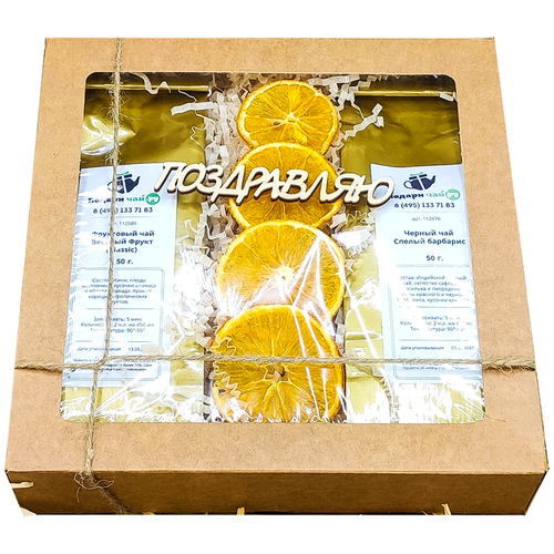 Состав набора: 2 вида рассыпного чая по 50 г, четыре дольки апельсина, деревянная открытка «Поздравляю».