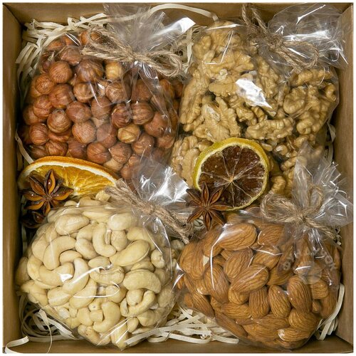 Отличный подарок для любого повода. Принесёт радость любому человеку и не запылится на полке! В набор входят: Фундук очищенный (сырой) 250 г, Грецкий орех очищенный () 250 г, Кешью очищенный (сырой) 250 г, Миндаль gold (сырой) 250 г.
