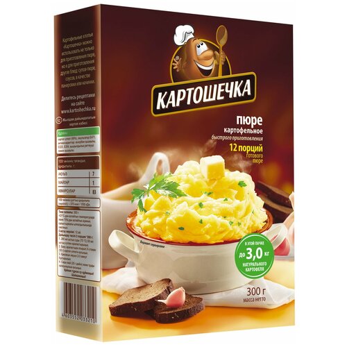 Пюре Картошечка быстрого приготовления, 300г. 12 порций готового пюре. Картофельные хлопья "Картошечка" можно использовать не только для приготовления пюре, но и для приготовления других блюд: супов-пюре, соусов, в качестве панировки или начинки.