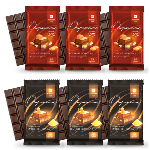 Шоколад Конфил набор 6 шт. по 95 г: горький шоколад 75% с целым миндалём, темный шоколад с апельсином