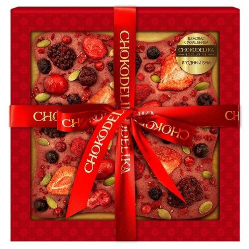 Состав: белый шоколад (сахар, масло какао, цельное сухое молоко, эмульгатор: соевый лецитин, натуральный ароматизатор ванильный), ягоды сушеные (клубника, ежевика, клюква, малина, вишня, черная смородина, черника, брусника, голубика), семена тыквы обжаренные, натуральный краситель "кармин". Белая шоколадная масса содержит массовые доли: общего сухого остатка какао — 27,3%, сухого общего остатка молока — 22,2%, молочного жира — 6,5%. Массовая доля насыщенных жирных кислот — 21,5%. Массовая доля трансизомеров ненасыщенных жирных кислот — менее 0,5%. Пищевая ценность на 100г продукта: белки — 6,5г; жиры — 30г; углеводы — 57г. Энергетическая ценность на 100г продукта: 530 ккал/ 2190 кДж. Условия хранения: в сухом прохладном месте при температуре 18 3°С и относительной влажности воздуха не более 75%. Вес: 180 грамм Тип упаковки: подарочная картонная коробка Размер упаковки (ДxШxВ) — 17x17x2 см. Страна производства: Россия Срок годности: 12 месяцев.