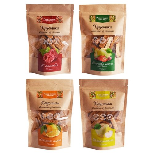 Яблочные Хрустики из пастилы без сахара от компании "Русские традиции" — это фирменный продукт, который готовится по старинному русскому рецепту 1888 года из яблок "Антоновка". В составе хрустиков исключительно натуральные ингредиенты без добавления сахара, глютена, красителей и консервантов. Каждый кусочек изготовлен в печи и упаковывается вручную. Так мы сохраняем всё самое полезное и вкусное, чтобы Вы получали всё самое необходимое. Приятного аппетита! В набор входят яблочные хрустики из пастилы 4-х вкусов: Малина, Фруктово-ягодное Ассорти (клубника, клюква, груша, вишня), Классические, Апельсин-лимон!