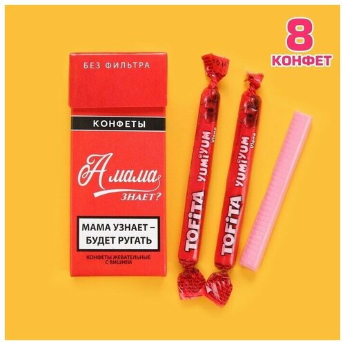 Состав: сахар, сироп глюкозный, масло растительное (пальмовое), регулятор кислотности (лимонная кислота), желатин говяжий, концентрат сока клубники (0,3 %), концентрат сока вишни (0,4 %), концентрат соков апельсина и лимона (0,2 %), эмульгаторы (Е471, лецитин подсолнечный), ароматизатор искусственный, идентичный натуральному, краситель (красный свекольный, Е160а). Срок годности: 24 месяца. Масса нетто: 50 г (±5 г)