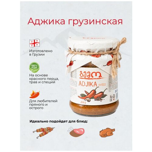 Аджика — энергетическая ценность (калорийность): 59.3 ККал на 100 грамм. Химический состав аджика: 1 г. белки, 3.7 г. жиры, 5.8 г. углеводы.